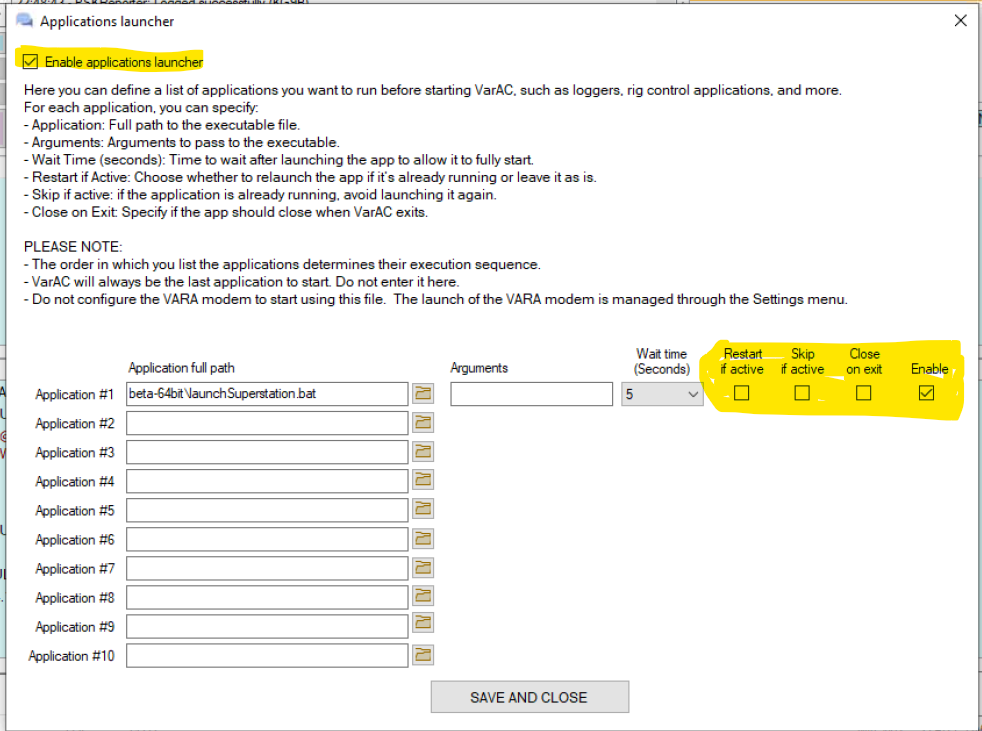 In VarAC Settings menu select Application launcher. Browse to the path for where superstationLauncher.bat is locationed and select that file. Next, make sure you check "Enable Application Launcher". Finally, make sure you only select the "Enable" is the only check-box enabled on the row with the applicaiton. Click the "SAVE AND COMPLETE" button. Close VarAC and re-launch. Superstation should load in the background during the VarAC load process. See scren show below for the screen shot of settings.
