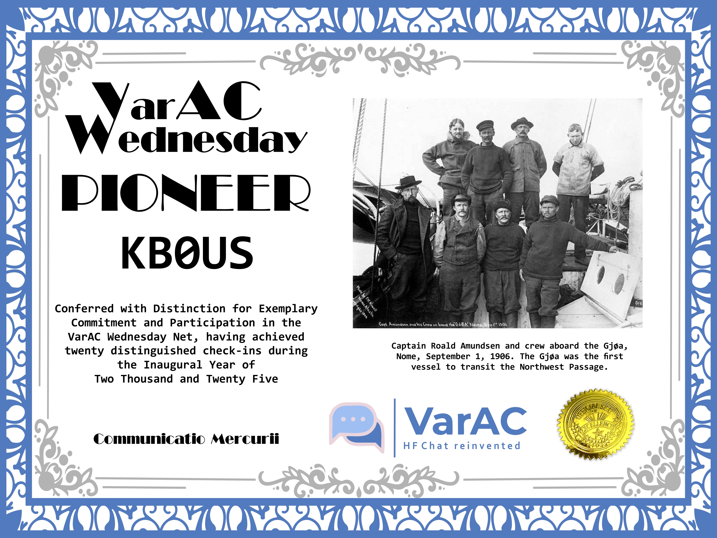 Any operator who completes at least 20 weekly VarAC Wednesday check-ins during the inaugural 2025 year will be recognized as a VarAC Pioneer. This award celebrates those who helped shape the rhythm and reliability of our global check-in community.